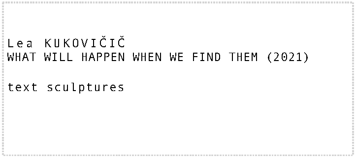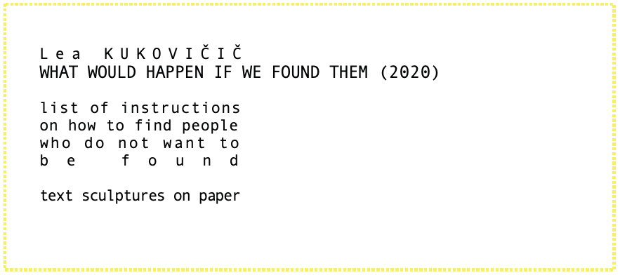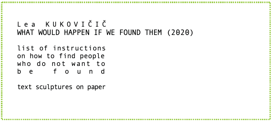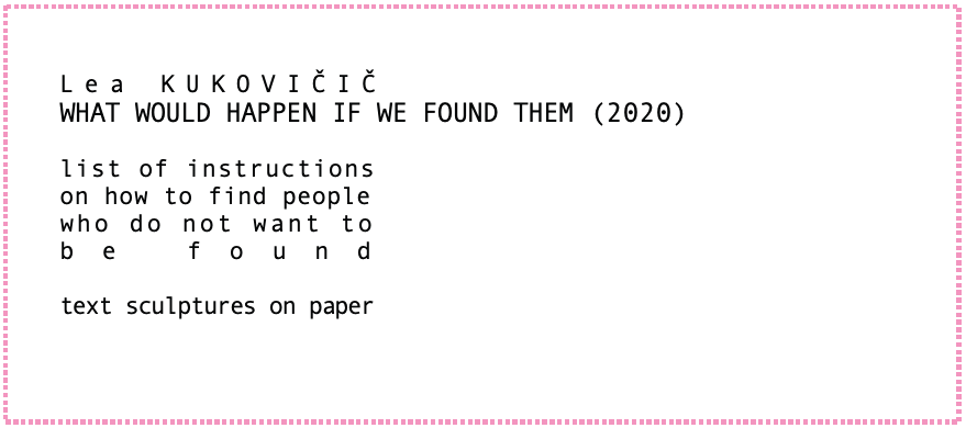 ‘What would happen if we found them’ is a work that features text in the form of instructions on how to find people who do not want to be found and is based on the artist’s family history, which took place in former Yugoslavia.