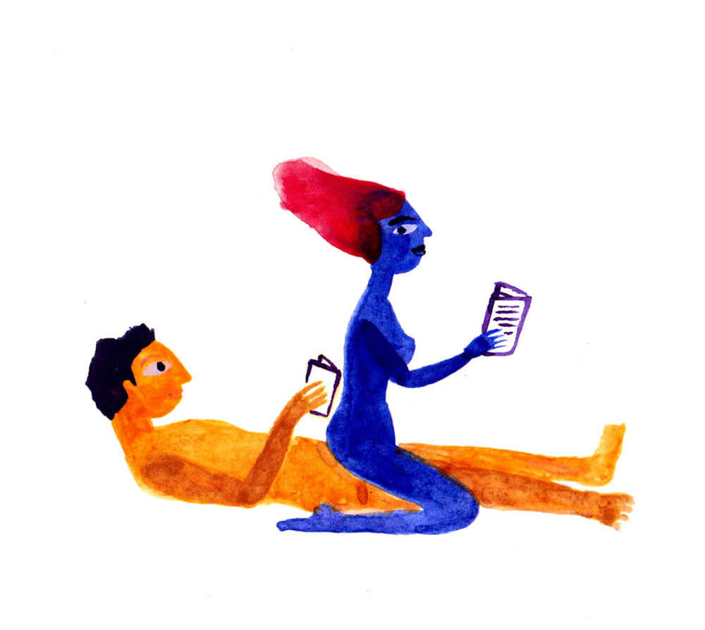 Read aloud. Some Spillovers try to read with their hands. Others try to connect books with their body and allow the paper (which used to be made of wood) to concentrate heat on their skin. They claim this is a way to incorporate reading, since they have forgotten how to trust it. Gradually, they are able to “sing”, breathing fast and producing a concentration of energy and heat, which turns letters into sounds, words into vapour, and vapour into mantras. The more they sing, the more vapour and heat they produce. And the more moisture they exude as they sing, the more the book they are reading vanishes.